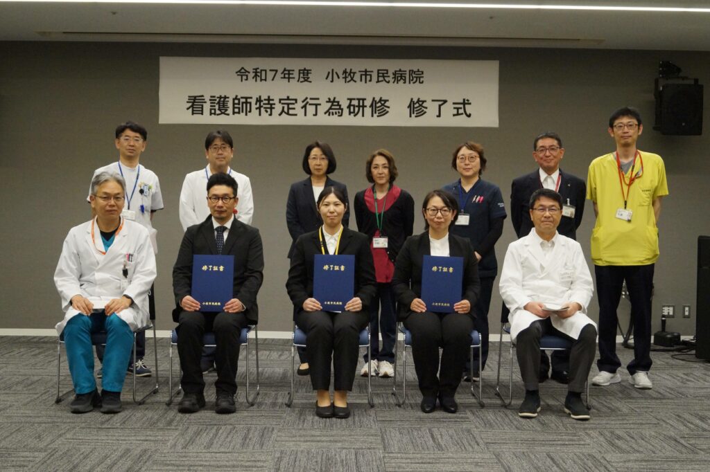 小牧市民病院での特定行為研修は、令和3年度より、区分別パッケージ“外科系基本領域”で開講しました。今年度は、外科系基本領域に腹腔ドレーン管理関連を追加した小牧外科系パッケージ研修と術中麻酔管理領域パッケージ研修の2つのコースを令和7年6月2日より開始し、約10か月にわたり、講義や演習、実習を行いました。そして今回、3名の研修生が無事に研修を修了することができました。